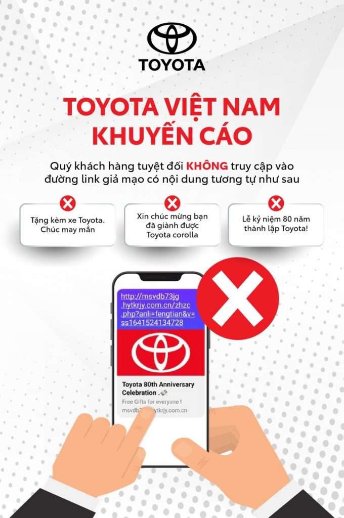 Thời gian gần đây xuất hiện một số đường link giả mạo, không chính thức về chương trình trúng thưởng 80 năm của Toyota qua hình thức: SMS, gửi đường link vào Messenger… Đây không phải thông tin chính thức của Toyota Việt Nam và hệ thống Đại lý Toyota trên toàn quốc. Vì vậy, […]
