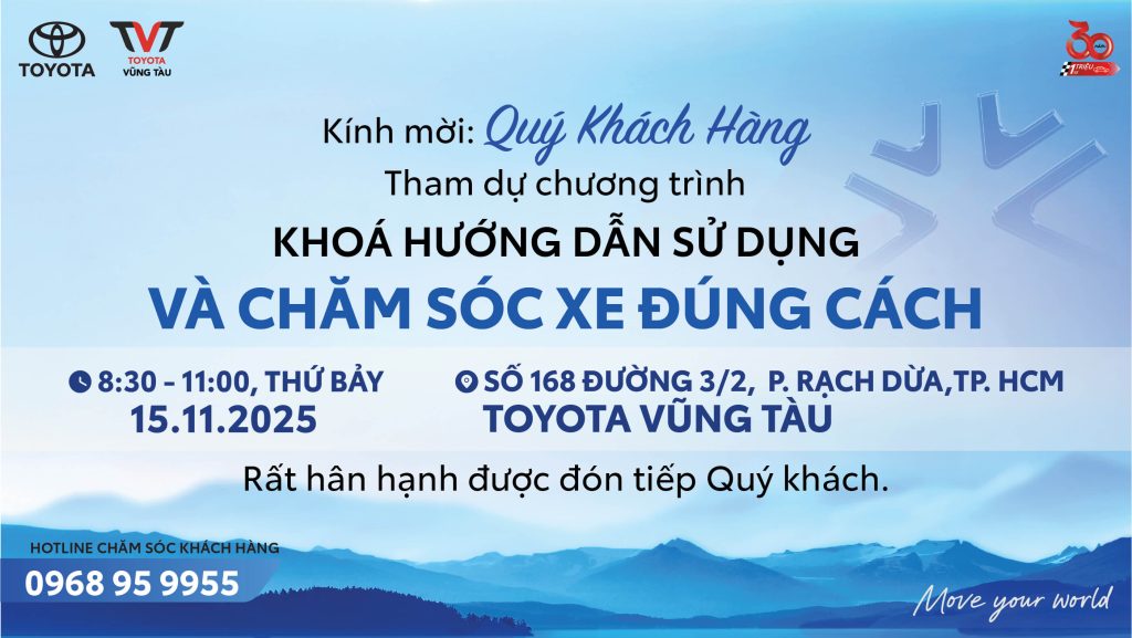 Hotline_Chăm_sóc_khách_hàng 𝟎𝟗𝟔𝟖 𝟗𝟓 𝟗𝟗𝟓𝟓Thời gian tổ chức: 08:30 đến 11:00, Thứ Bảy, 15.11.2025 Địa điểm: Showroom Toyota Vũng Tàu – Số 168 Đường 3/2, P. Rạch Dừa, TP. Hồ Chí Minh ——o0o—–o0o—–o0o—– Nhằm cung cấp cho những khách hàng mới mua xe các kiến thức cơ bản về xe cũng như cách vận hành và […]
