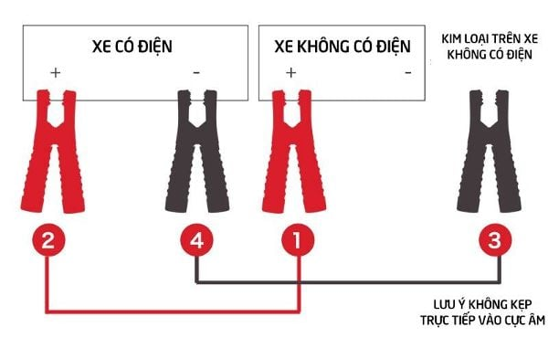 - Đầu còn lại kẹp vào cực dương ắc quy của xe hỗ trợ