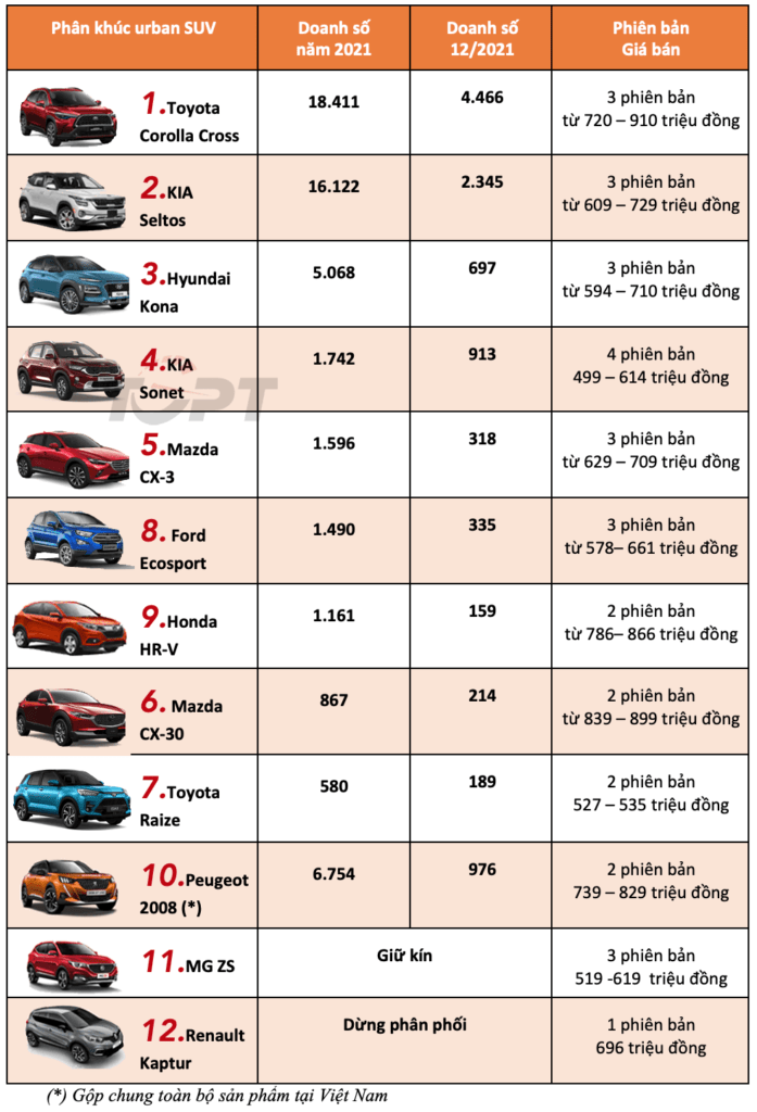 Với hơn 18.400 chiếc bán ra trong năm 2021, Toyota Corolla Cross vượt qua đối thủ KIA Seltos tới hơn 4.000 xe. Chỉ tính riêng tháng 12/2021 vừa qua, mẫu xe Nhật Bản này cũng đã bán ra hơn 4.466 xe, vượt qua các đối thủ chính thức khá xa. Điều này không chỉ giúp Toyota Corolla Cross đứng vững ở ngôi đầu phân khúc Urban SUV mà còn giúp mẫu xe này đứng thứ 4 trong danh sách mẫu xe bán nhiều nhất tại Việt Nam năm 2021.