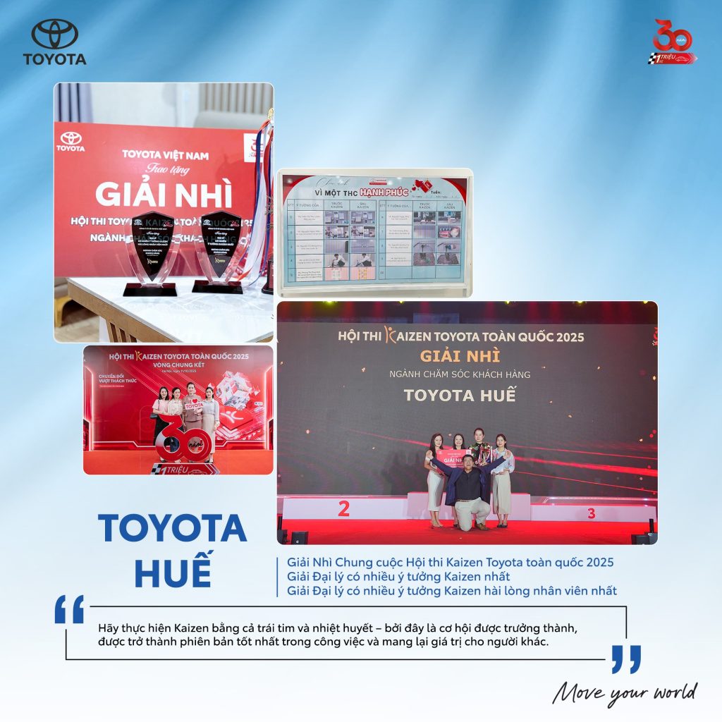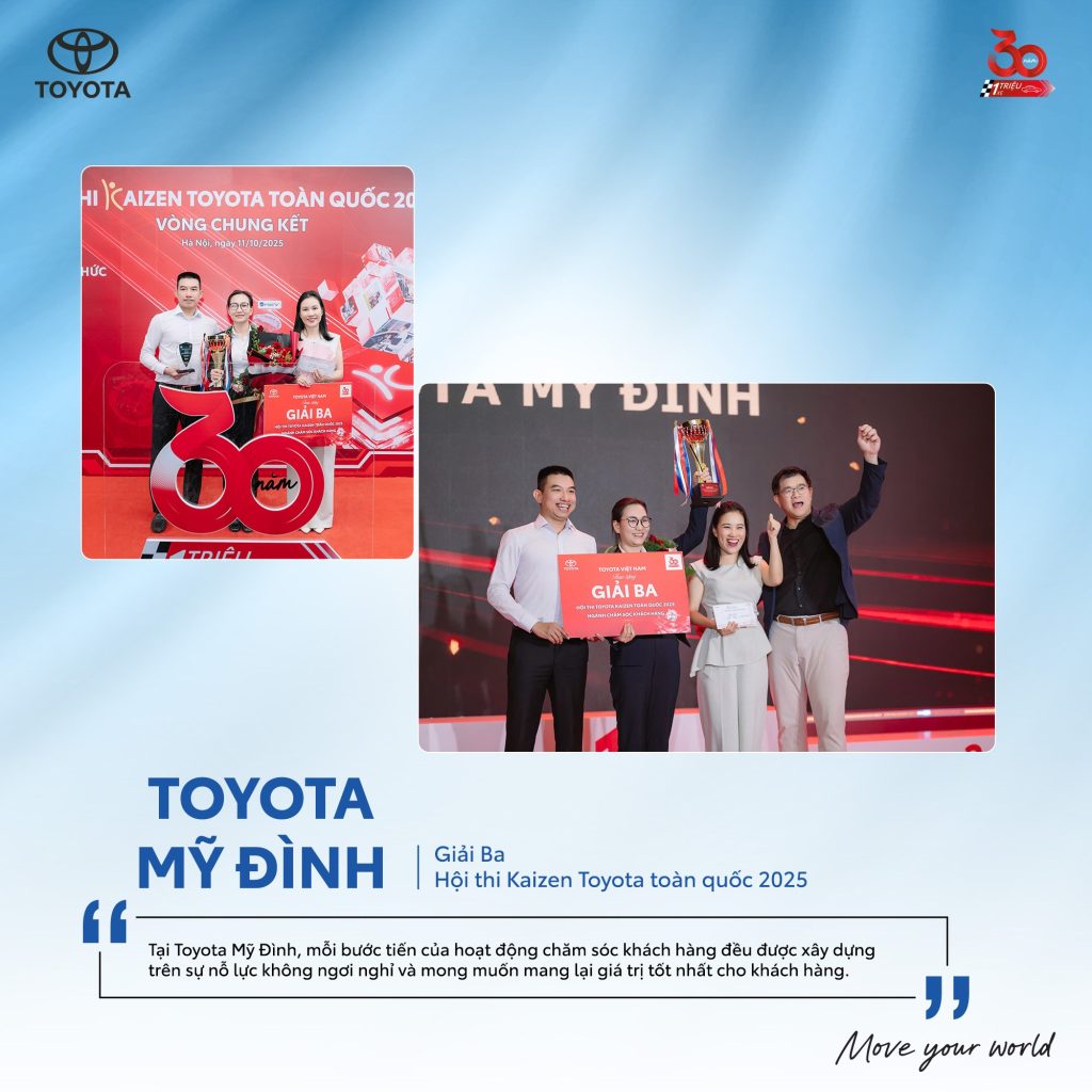 Song song với đó là Hội thi Kaizen toàn quốc Toyota, một sân chơi sáng tạo dành cho các tập thể đại lý với hàng trăm đề tài cải tiến mỗi kỳ thi. Trải qua 6 lần tổ chức, hội thi không chỉ khuyến khích tinh thần đổi mới liên tục mà còn góp phần nâng cao hiệu quả, cải thiện môi trường làm việc và mang lại giá trị thiết thực cho khách hàng cũng như cộng đồng.